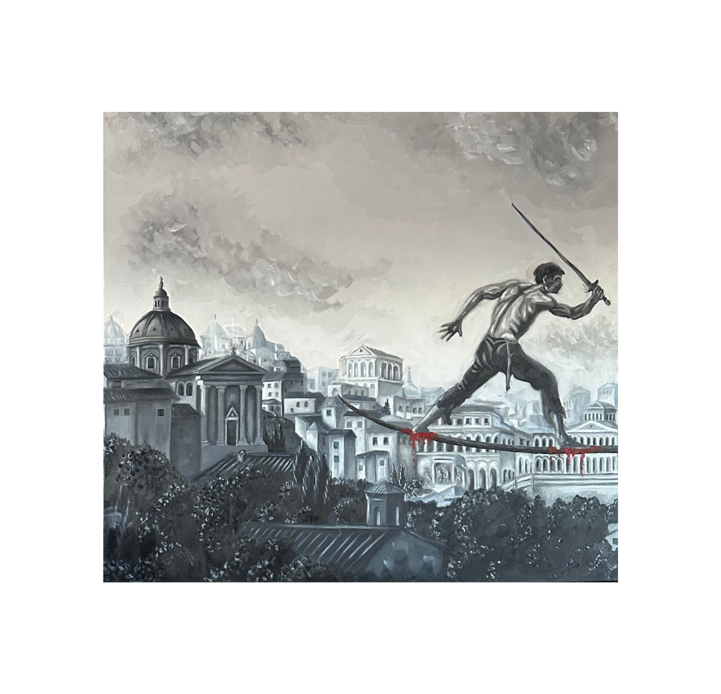 Oil on canvas, executed in layered grisaille with selective chromatic emphasis.