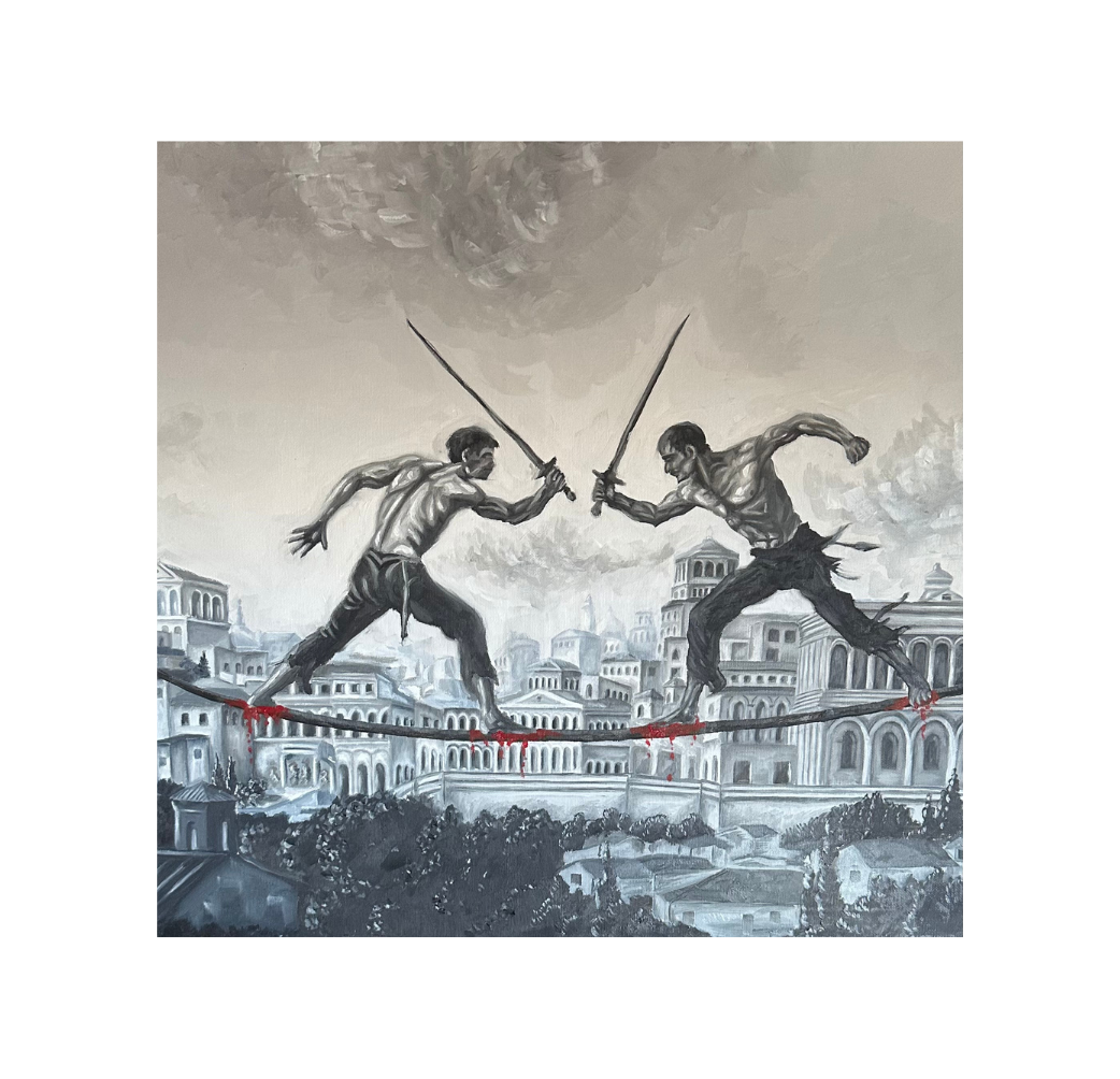 This piece explores the blindness of conflict. Two figures are locked in a desperate struggle, fighting on the edge of a blade, unaware that their suffering sustains the one who watches. They do not bleed for victory, but for a system that profits from their ignorance. Rendered in a cold, colorless grisaille, the only truth permitted to remain visible is blood.